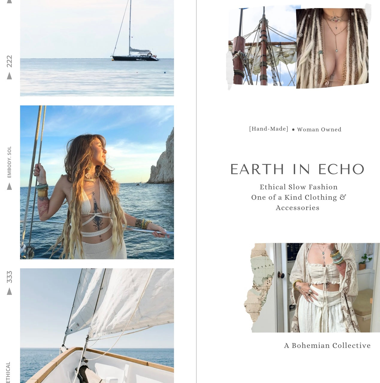 Hi, I’m Natalie! I’m 26 and the heart behind Earth in Echo, a small, ethical slow-fashion ship shop. Every treasure I carry is handmade by wonderful families and fellow small businesses I’m proud to call my crew. Each piece reflects the raw beauty of its origins and is imbued with a sense of worldliness and respect for artisanal traditions. I run Earth in Echo from my sailboat, Sol, where every item is lovingly packed with a little healing energy from the sea. Sustainability is at the core of everything I do- I hope to inspire you to get your sea legs into slow fashion and live more mindfully. Living on the water, I witness first-hand the damage plastic and waste cause our oceans and wildlife. My mission is simple: to tread lightly on our planet, share my love for slow fashion, and make a positive impact. It’s our mission as guardians of Earth to tread her lands & seas more gracefully by hearing Earths Echo in everything we do.